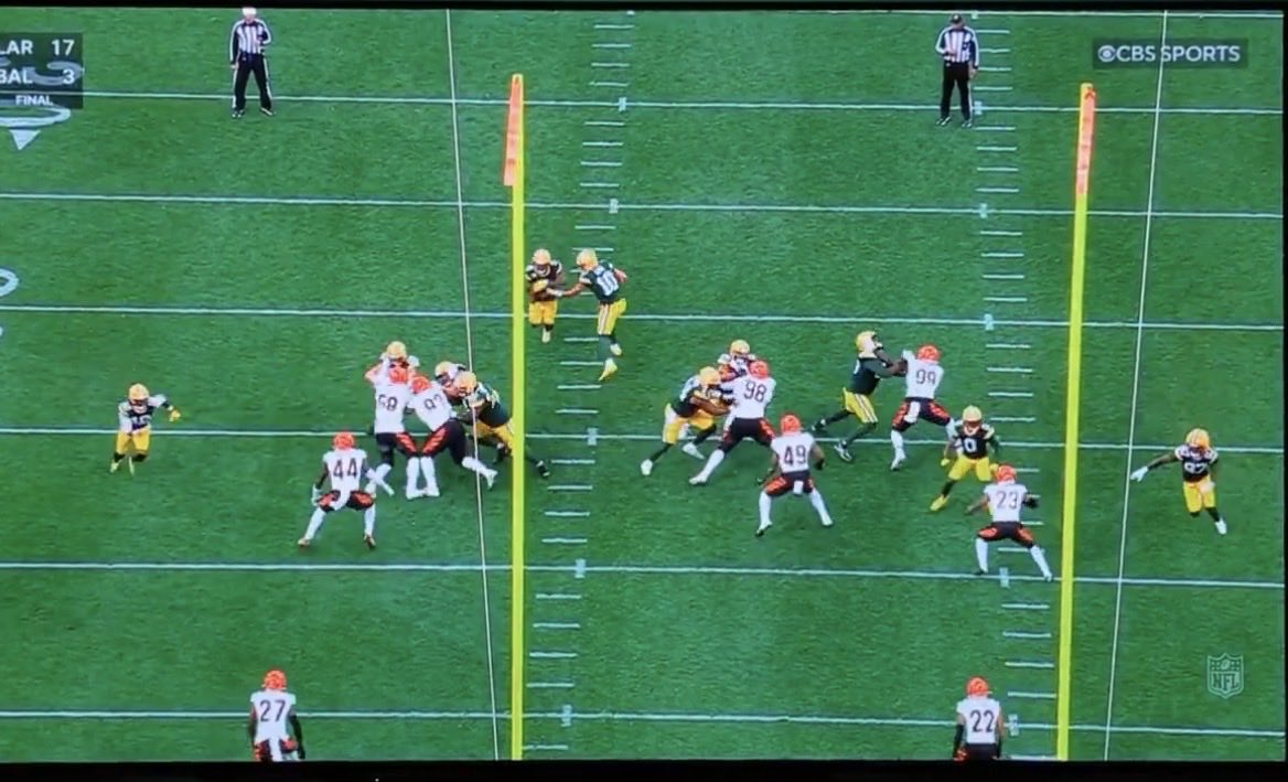 Este año no podemos culpabilizar a la defensa de todos los males del equipo, pero esto no significa que podamos sentirnos satisfechos. Es cierto que, tras estar mucho tiempo en el campo, le faltaba el resuello a nuestros jugadores. Pero en la segunda mitad apenas si opusieron resistencia. Todos los drives de Green Bay acabaron en anotación (TD-TD-FG), incluyendo errores de concepto muy groseros. A la ya consabida falta de pass-rush (agravada tras la lesión de Hendrickson) hay que sumar numerosos fallos de placaje, que derivaron en un lamentable porcentaje de 4,6 yardas concedidas de promedio cada vez que nuestro rival corría con el balón. Daba la impresión de que si hubieran tenido que anotar más puntos, lo hubieran podido hacer.